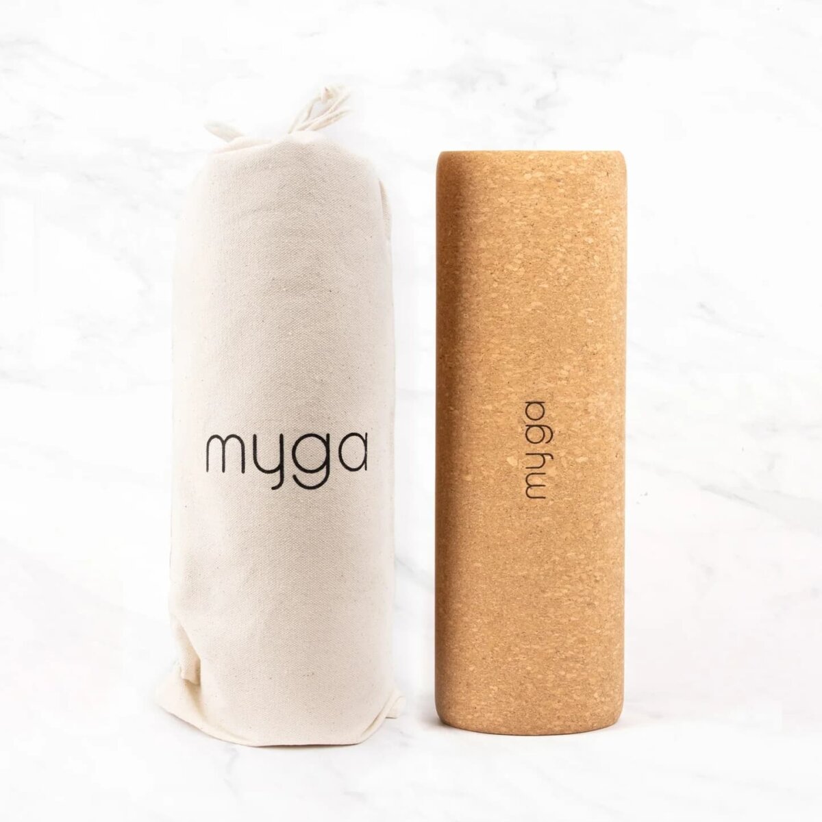 Le rouleau de liège Myga est livré avec un sac de transport pratique en coton à cordelette.