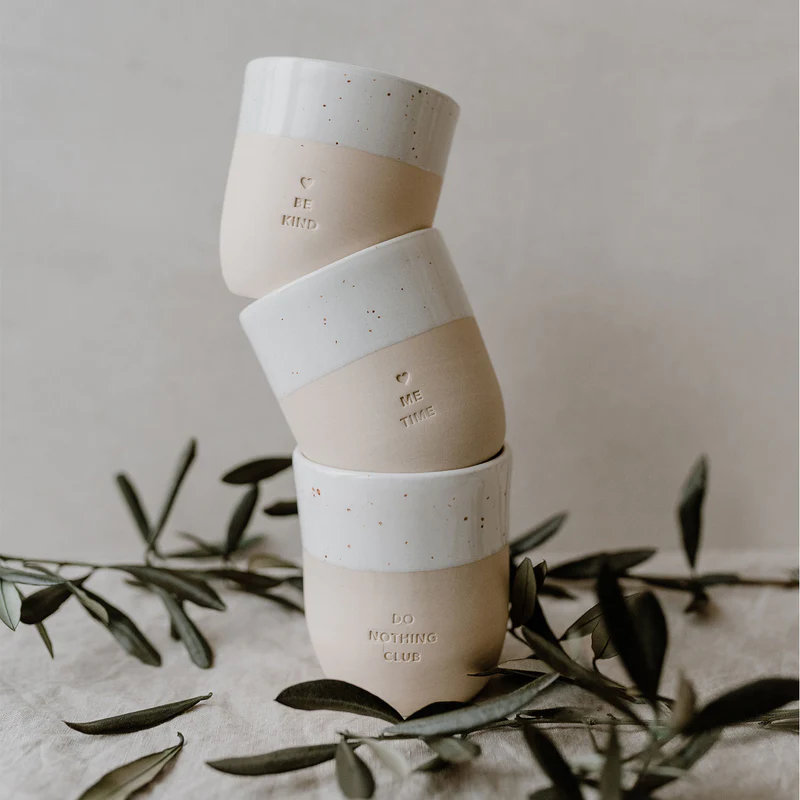 Die Becher zeichnen sich durch ihre einzigartigen Charakteristika aus, da sie in Handarbeit geformt, gebrannt, geprägt, abgeschliffen, geglazt und erneut gebrannt werden. Dadurch entstehen Unterschiede in der Drucktiefe, Höhe und Geradlinigkeit, die jedem Becher einen individuellen Style verleihen.