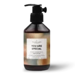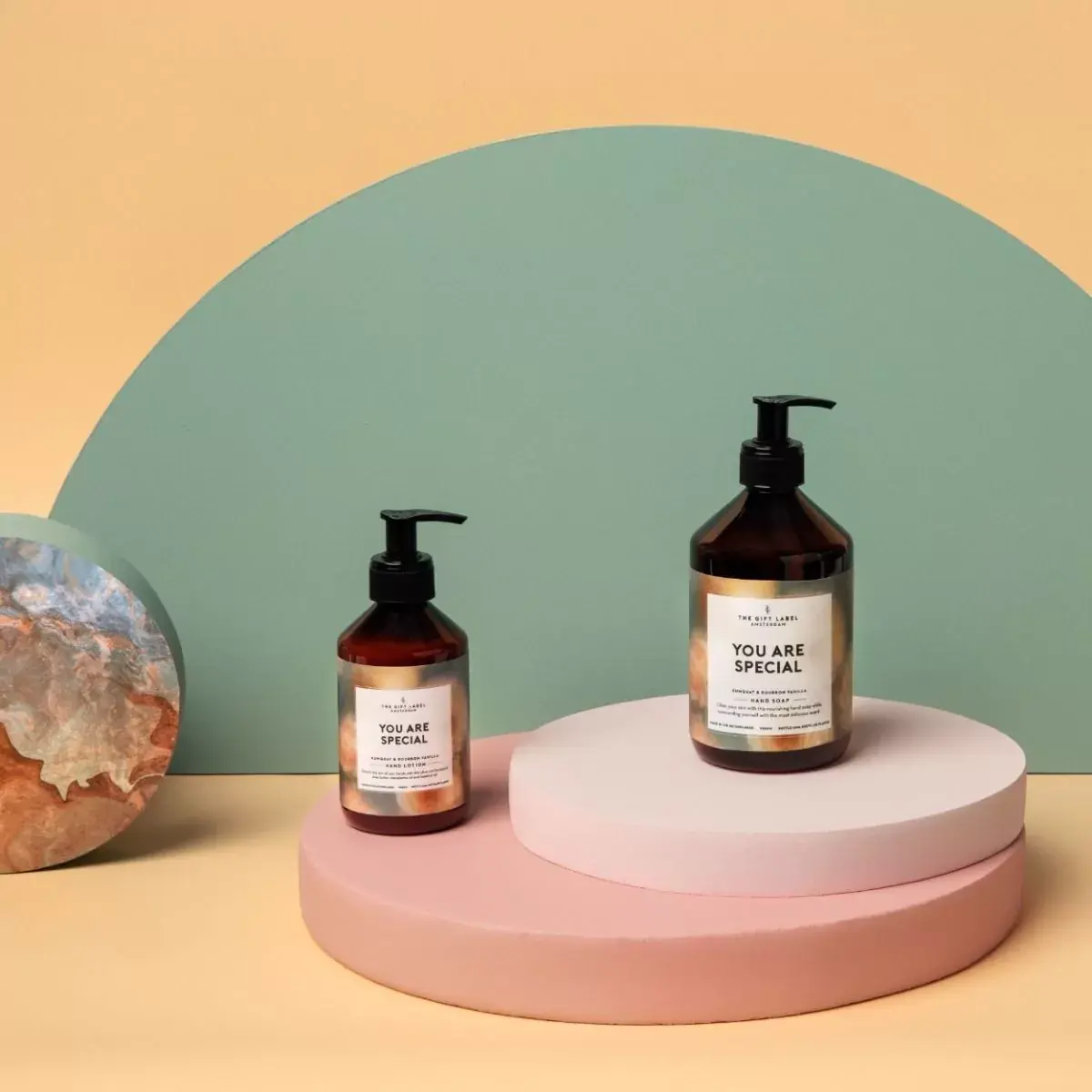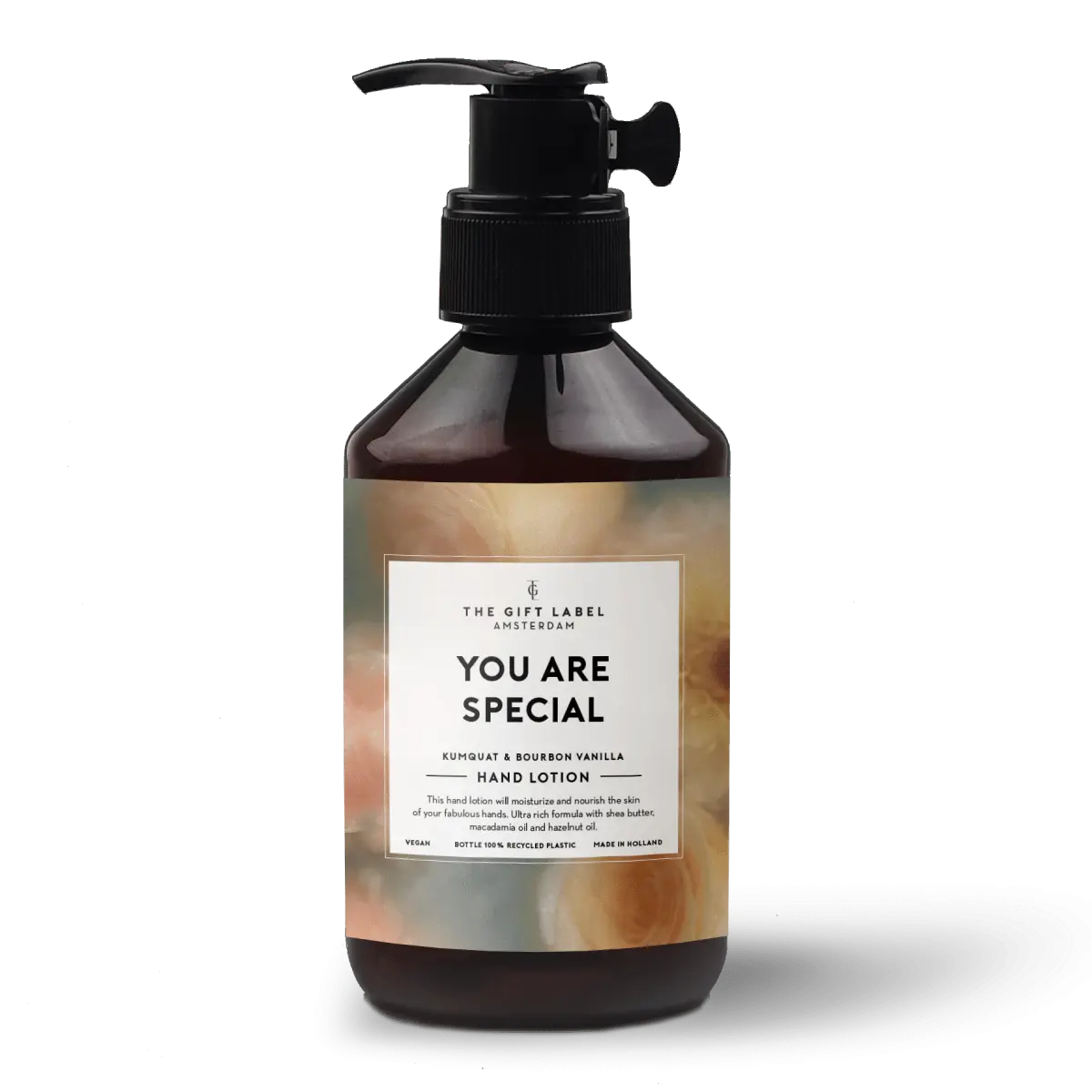 Diese vegane Handlotion pflegt deine Hände und duftet nach Kumquat & Bourbon-Vanille. Die 100% recycelten Plastikflaschen haben schöne Designs und erhebende Zitate.
