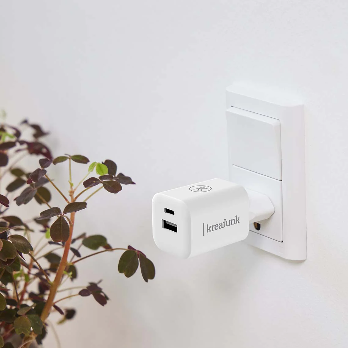 Der Kreafunk aDapt Fast Charger verfügt über ein USB-A- und -C-Ausgang, der schnelles und effizientes Laden zu Hause, im Büro oder unterwegs ermöglicht.