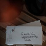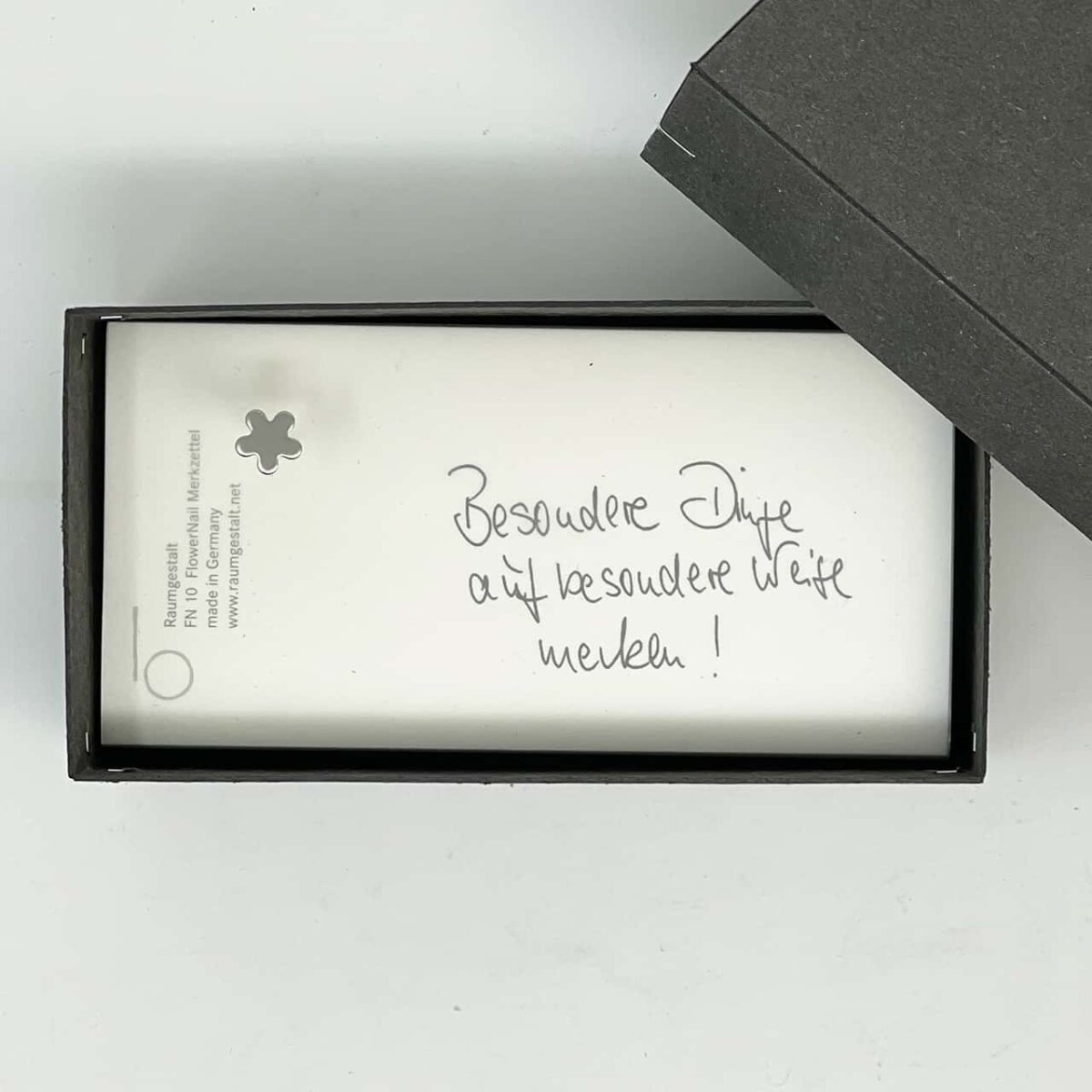 Zettel mit einem FlowerNail auf einen Eichenklotz genagelt.